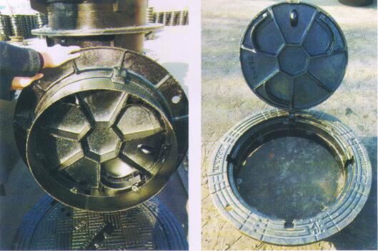 餃鏈?zhǔn)椒ㄌm上置球鐵蓋板,可開啟110°,井蓋頂端有3組自卡簧設(shè)計,保證頂蓋的平穩(wěn),底框配有氧J橡膠,底框加路面瀝青施工,與路面平齊,并增強附著力,防止路面下沉,井架與井框餃鏈位置通過不銹鋼螺栓緊固鏈接,井蓋開啟90°,可安全自鎖。