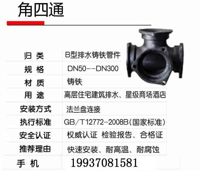 廠家直銷鑄鐵排水管件-B型鑄鐵管件直角四通 法蘭盤連接,快速安裝,耐高溫,耐腐蝕;用于高層住宅建筑排水、星際商場(chǎng)酒店。