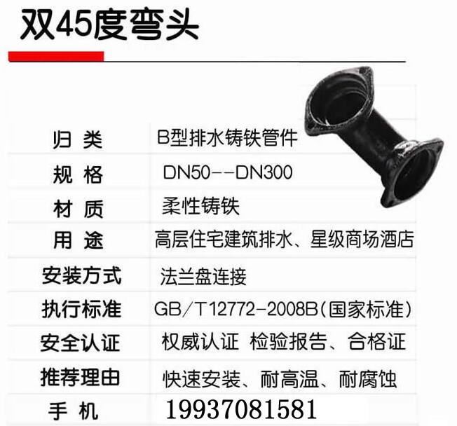 鑄鐵雙45度彎頭 B型離心機(jī)制法蘭連接柔性排水鑄鐵彎頭,柔性抗震鑄鐵,快速安裝,耐高溫,耐腐蝕;用于高層住宅建筑排水、星際商場酒店。