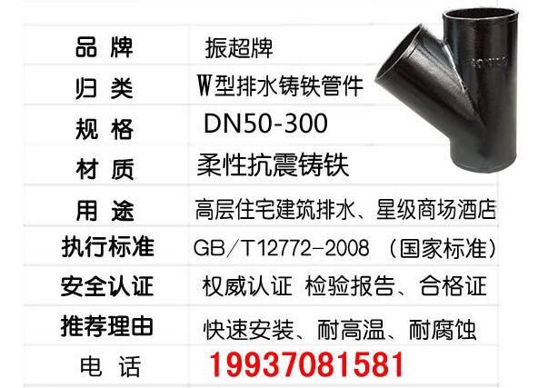 振超牌W型鑄鐵排水管件,柔性抗震鑄鐵,快速安裝,耐高溫,耐腐蝕;用于高層住宅建筑排水、星際商場(chǎng)酒店。