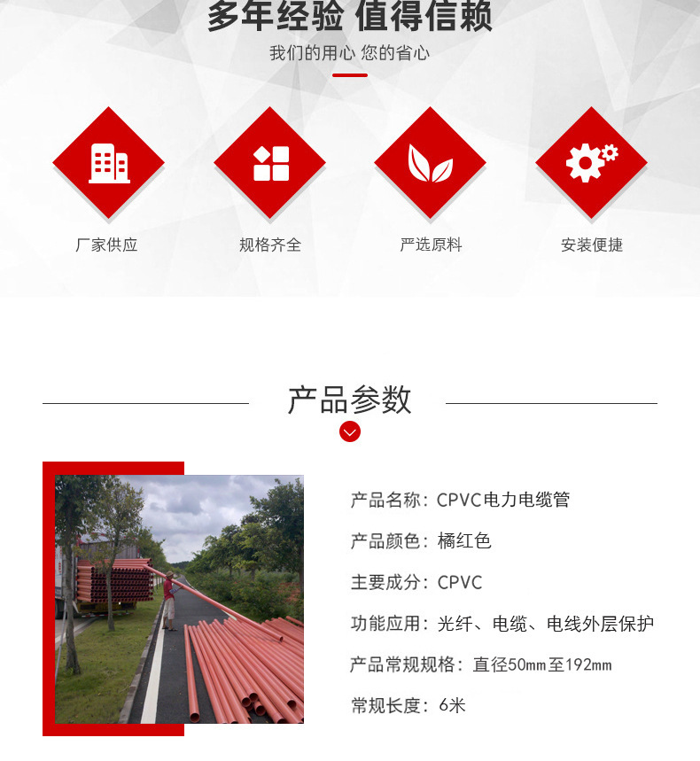 【河南廠家直供】國(guó)標(biāo)CPVC電力電纜保護(hù)管,耐高溫90℃·耐強(qiáng)酸堿·環(huán)剛度SN8-SN16,抗壓≥10噸不變形,消防/電力驗(yàn)收達(dá)標(biāo)。免費(fèi)提供樣品+檢測(cè)報(bào)告,立即咨詢技術(shù)參數(shù)→