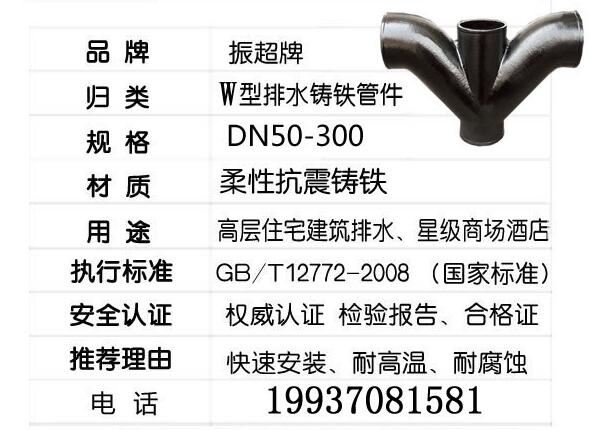 振超牌W型鑄鐵排水管件,柔性抗震鑄鐵,快速安裝,耐高溫,耐腐蝕;用于高層住宅建筑排水、星際商場(chǎng)酒店。