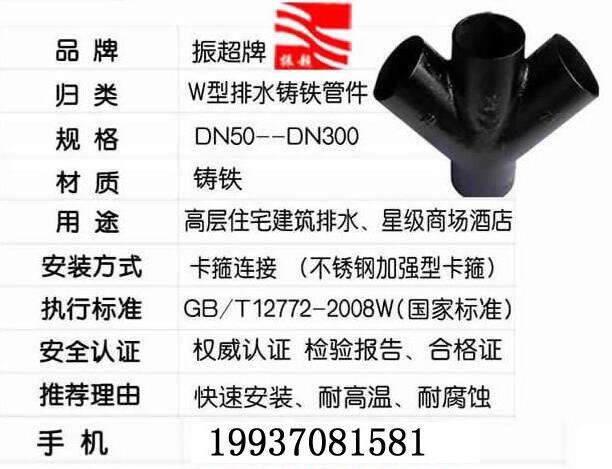 振超牌W型鑄鐵排水管件,鑄鐵,卡箍連接;快速安裝,耐高溫,耐腐蝕;用于高層住宅建筑排水、星際商場(chǎng)酒店。
