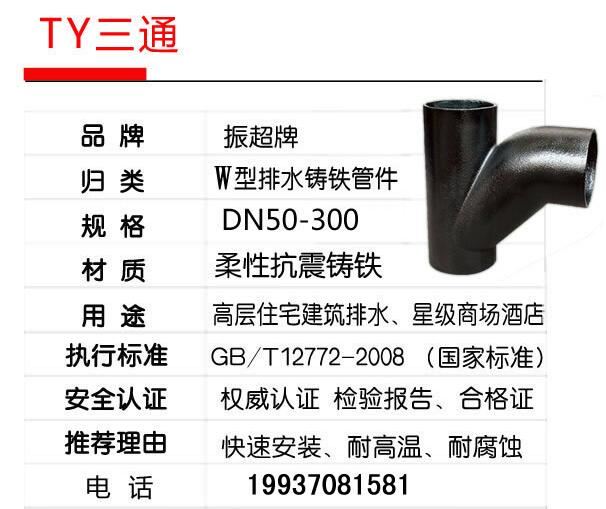 振超牌W型鑄鐵排水管件,柔性抗震鑄鐵,快速安裝,耐高溫,耐腐蝕;用于高層住宅建筑排水、星際商場(chǎng)酒店。