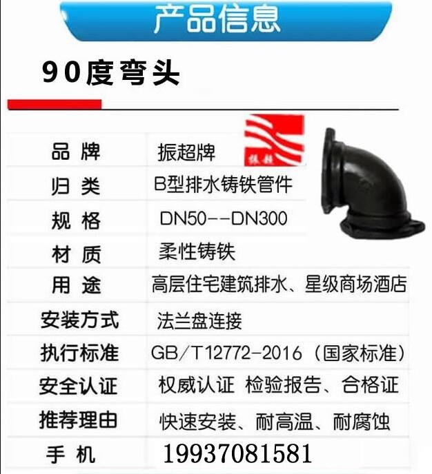 柔性鑄鐵排水管管件 柔性鑄鐵配件 B型90度彎頭,快速安裝,耐高溫,耐腐蝕。